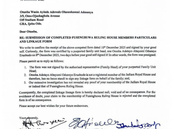 As the race for the throne of the Awujale of Ijebuland,hots up,the Fusengbuwa Ruling House of Ijebu Ode,has set Monday, January 12, 2026, as the new date for its official nomina...